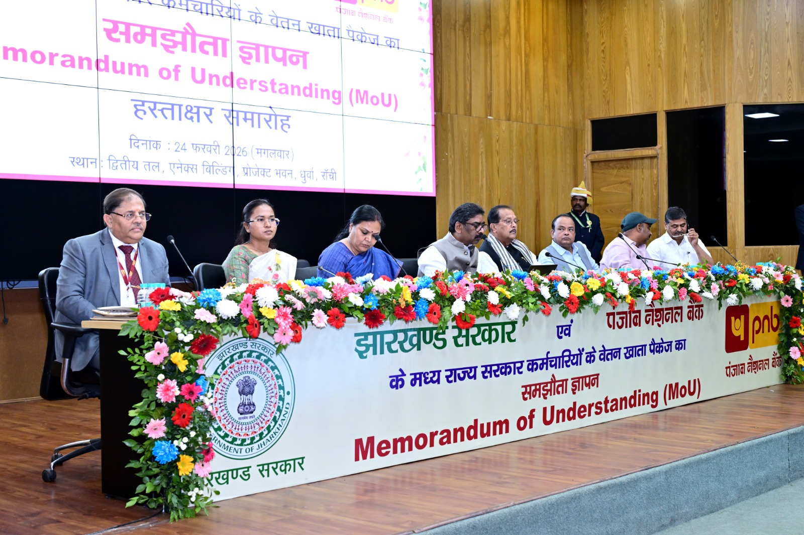 झारखंड सरकार एवं पंजाब नैशनल बैंक के मध्य राज्य सरकार कर्मचारियों के वेतन खाता पैकेज का समझौता ज्ञापन हस्ताक्षर समारोह में सम्मिलित हुए मुख्यमंत्री श्री हेमन्त सोरेन।